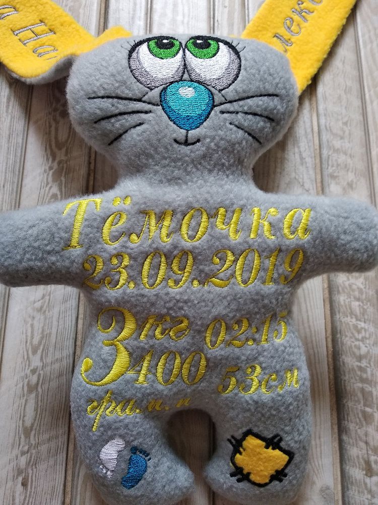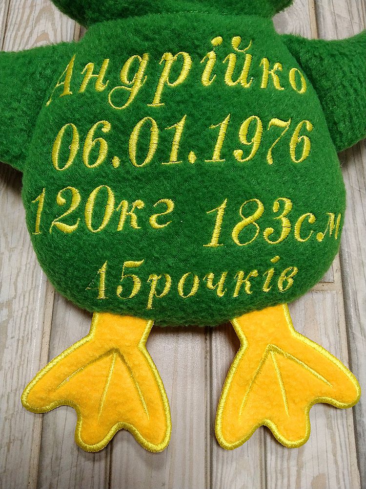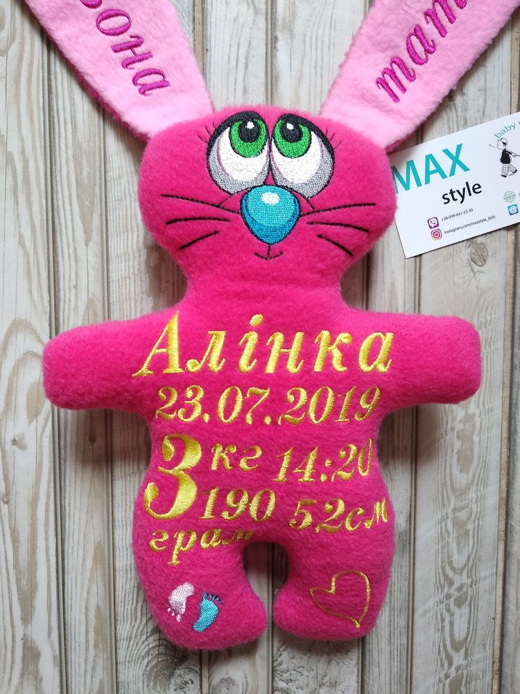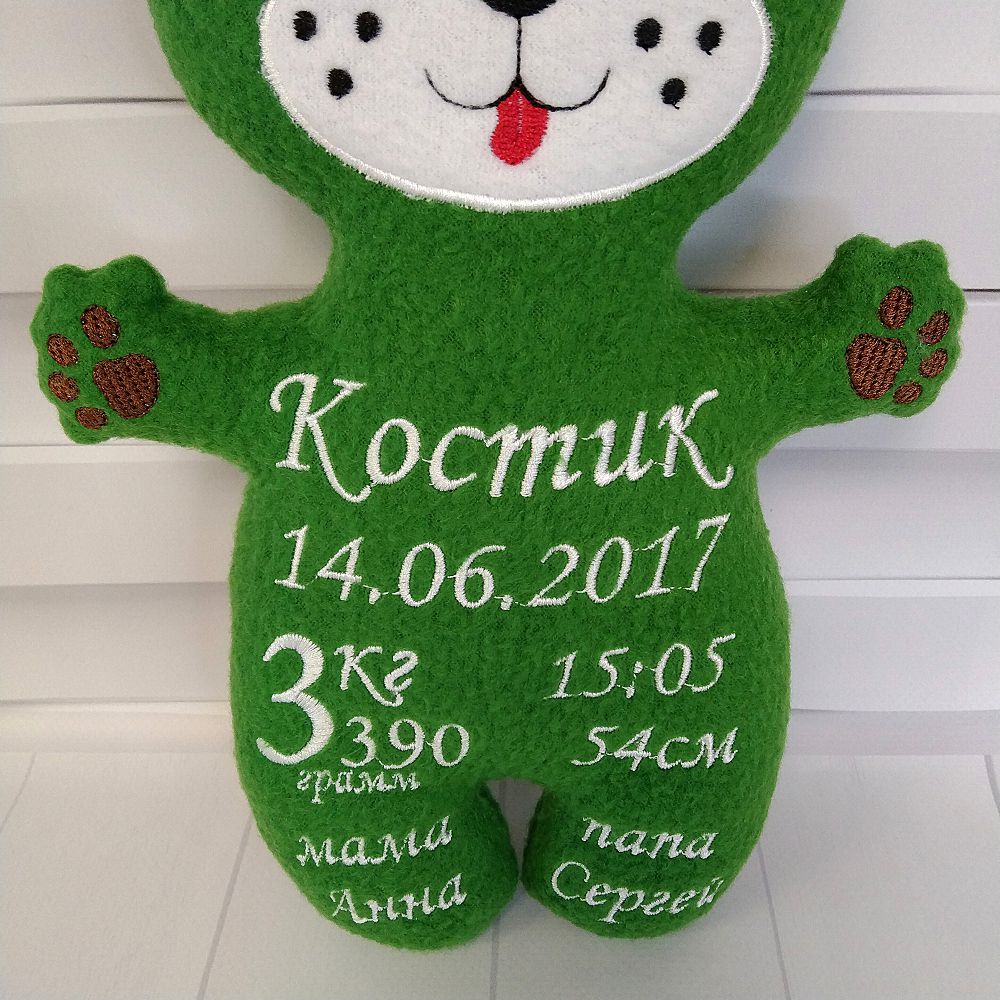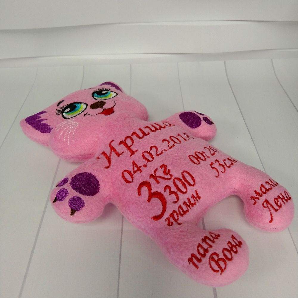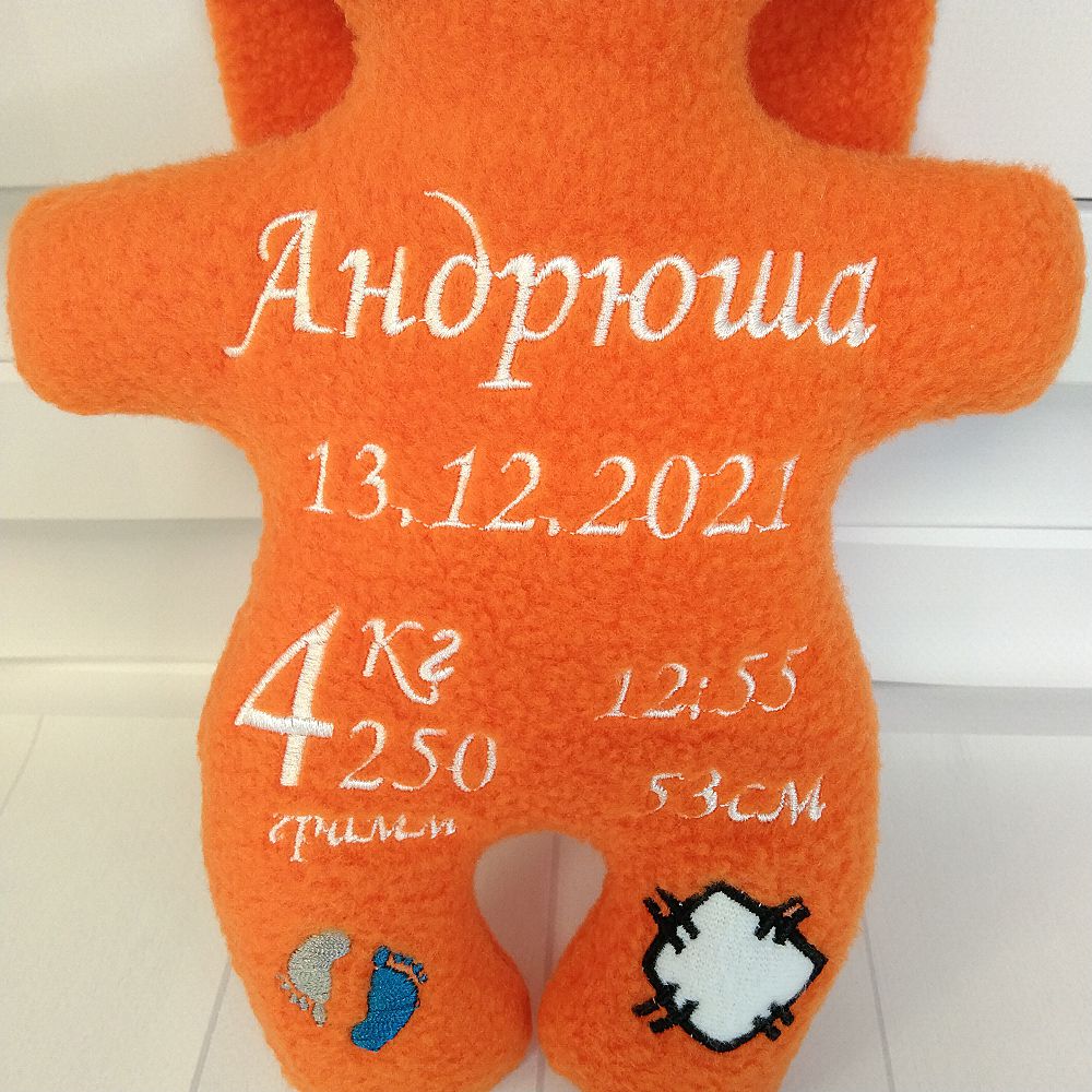 Ця іграшка унікальна, тому що можна підписати ім'ям дитини, написати побажання, дату народження – все, що забажаєте. Завдяки фактурі цієї тканини (пошитий з найніжнішого флісу), іграшка виходить плюшевою, м'якою і дуже приємною на дотик. Гіпоалергенний наповнювач - Hollowsoft. Для вишивки використовуються якісні поліестерові нитки, які стійкі до прання з хлором, світла та стирання.