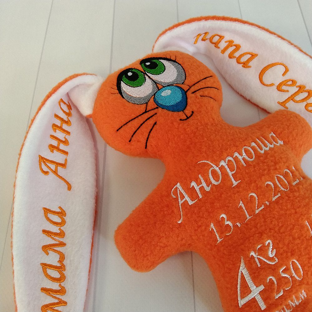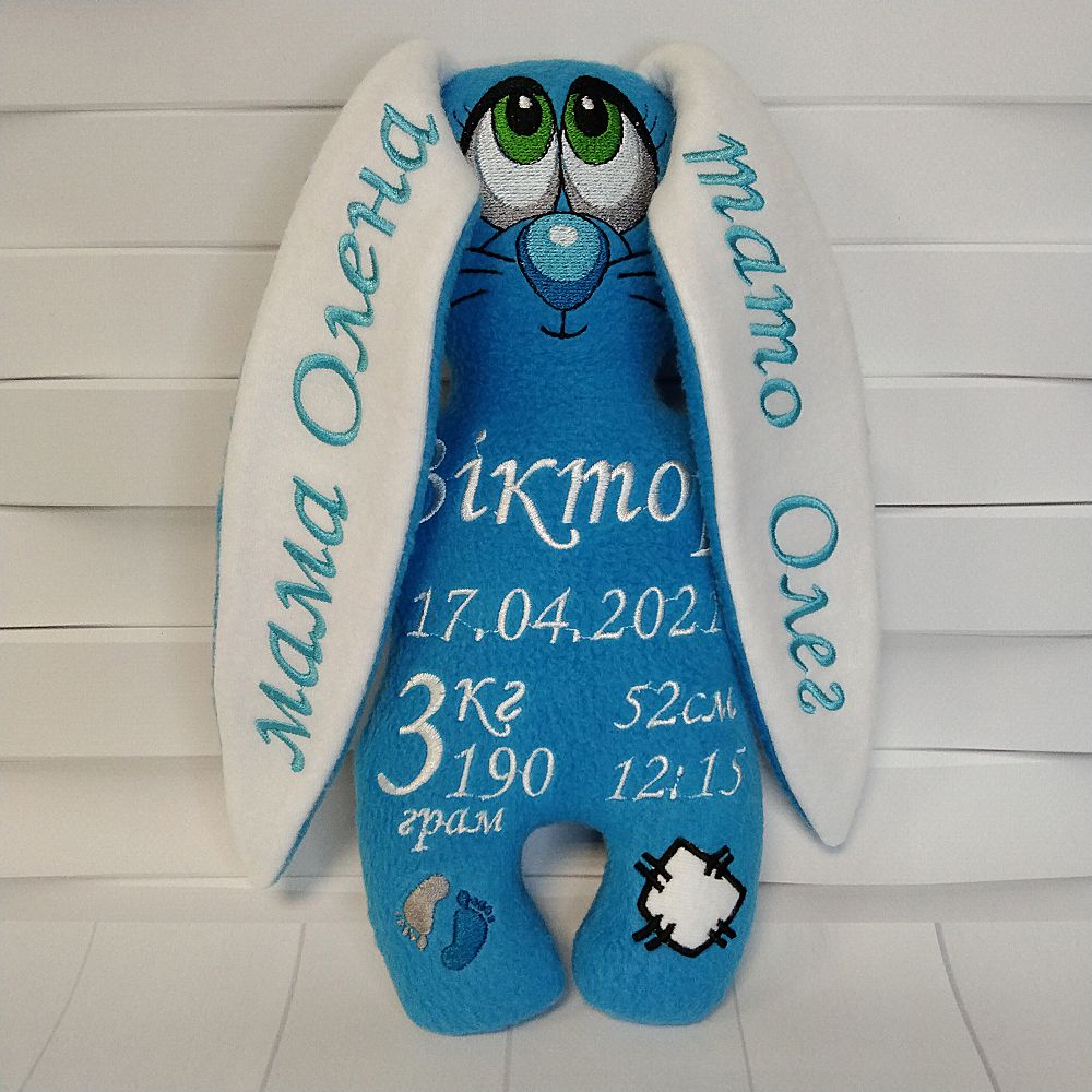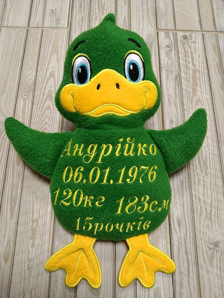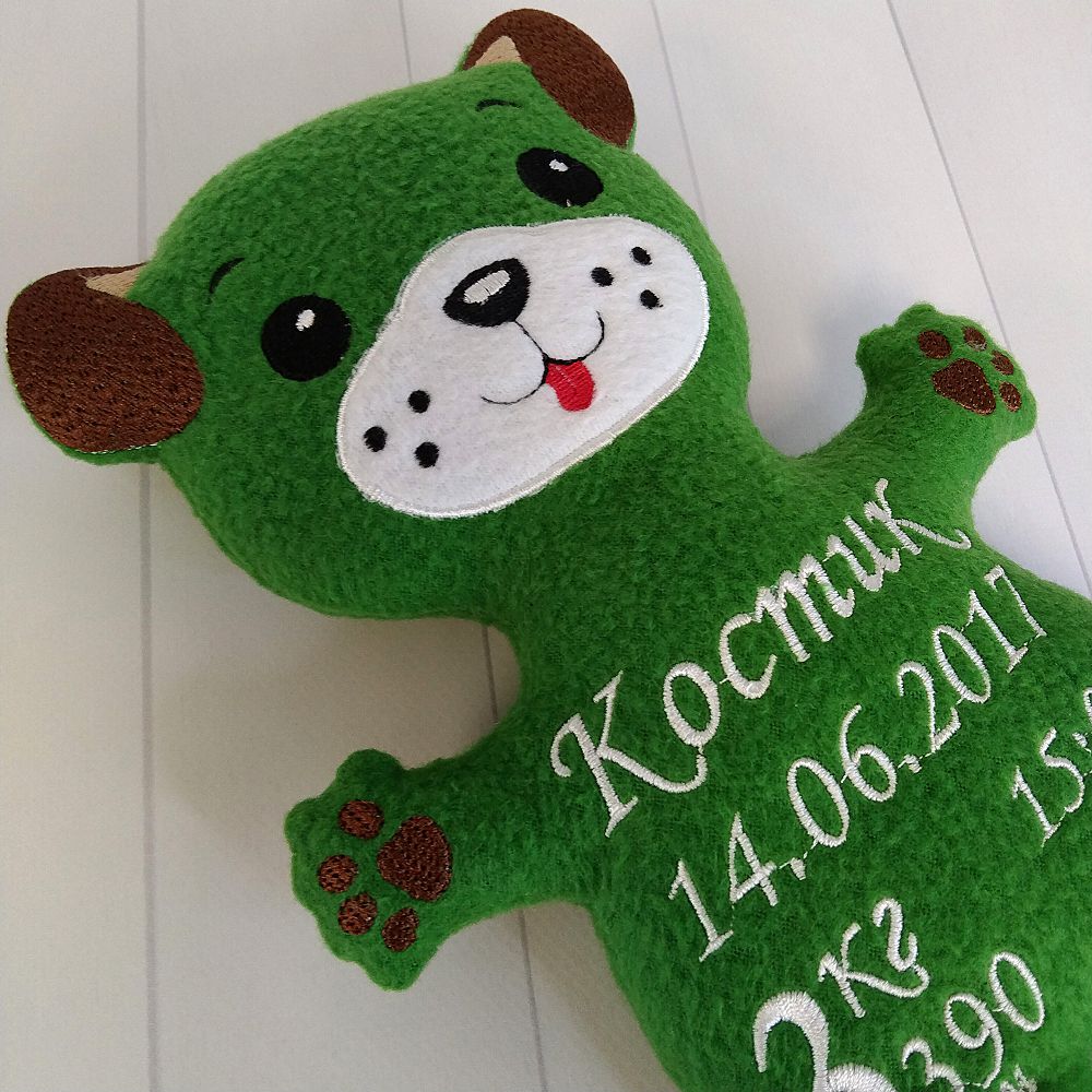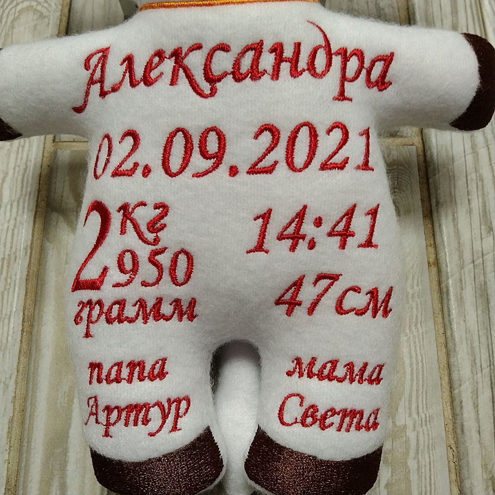 Ця іграшка унікальна, тому що можна підписати ім'ям дитини, написати побажання, дату народження – все, що забажаєте. Завдяки фактурі цієї тканини (пошитий з найніжнішого флісу), іграшка виходить плюшевою, м'якою і дуже приємною на дотик. Гіпоалергенний наповнювач - Hollowsoft. Для вишивки використовуються якісні поліестерові нитки, які стійкі до прання з хлором, світла та стирання.