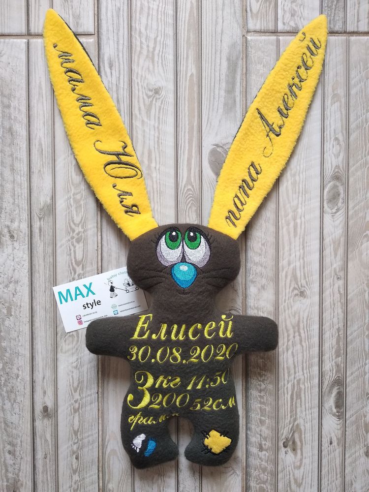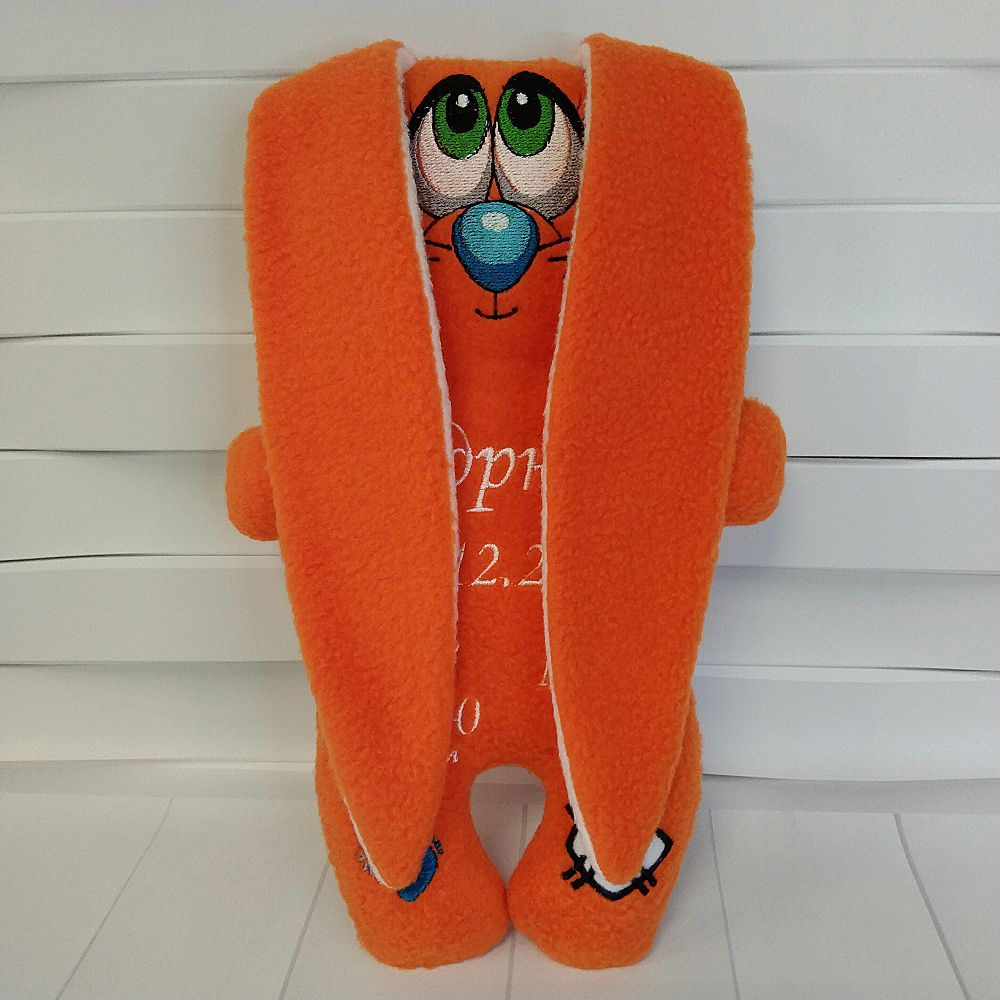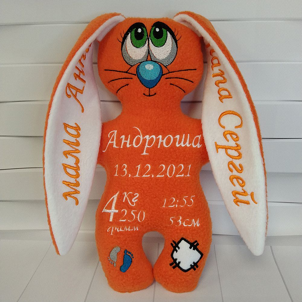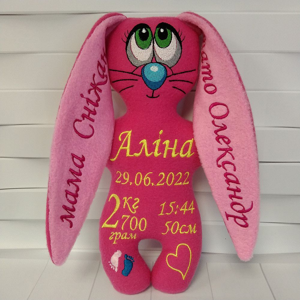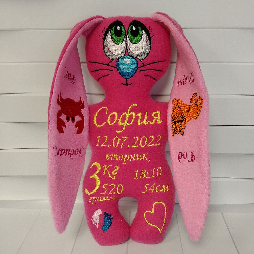 Ця іграшка унікальна, тому що можна підписати ім'ям дитини, написати побажання, дату народження – все, що забажаєте. Завдяки фактурі цієї тканини (пошитий з найніжнішого флісу), іграшка виходить плюшевою, м'якою і дуже приємною на дотик. Гіпоалергенний наповнювач - Hollowsoft. Для вишивки використовуються якісні поліестерові нитки, які стійкі до прання з хлором, світла та стирання.
