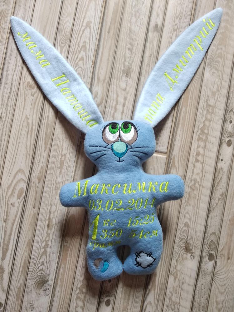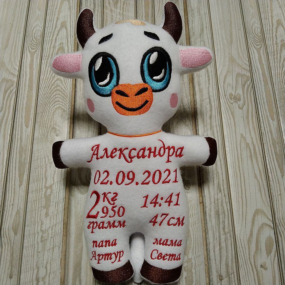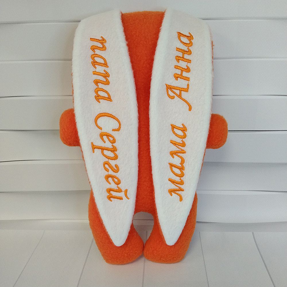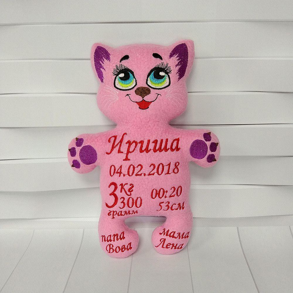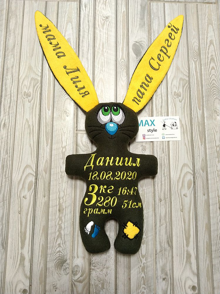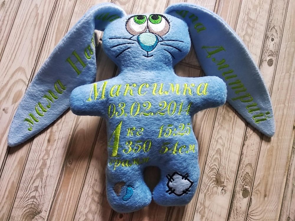 Ця іграшка унікальна, тому що можна підписати ім'ям дитини, написати побажання, дату народження – все, що забажаєте. Завдяки фактурі цієї тканини (пошитий з найніжнішого флісу), іграшка виходить плюшевою, м'якою і дуже приємною на дотик. Гіпоалергенний наповнювач - Hollowsoft. Для вишивки використовуються якісні поліестерові нитки, які стійкі до прання з хлором, світла та стирання.